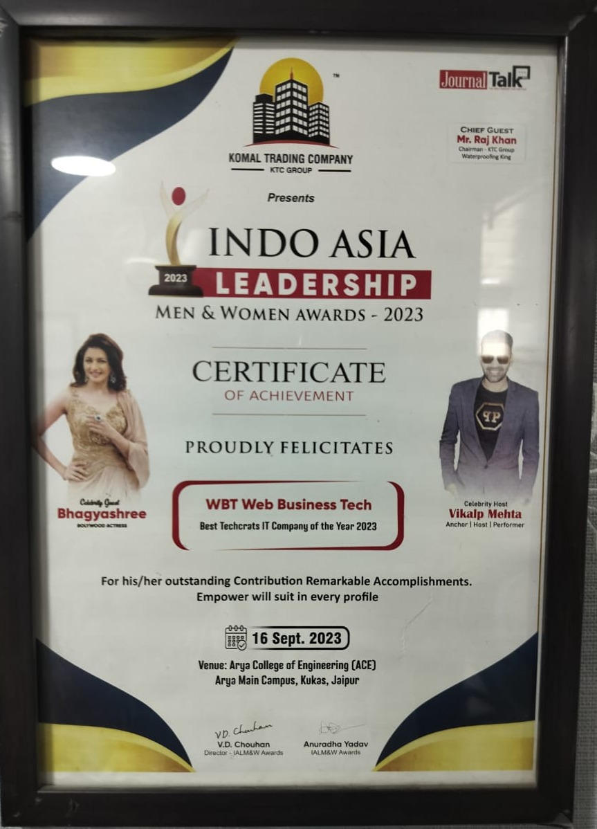 We are proud to announce that Web Business Tech Pvt. Ltd. has been honored with the prestigious "Best Techcrafts IT Company of the Year 2023" at the Indo Asia Leadership Men & Women Awards – 2023, held on 16th September 2023 at Arya College of Engineering, Jaipur.